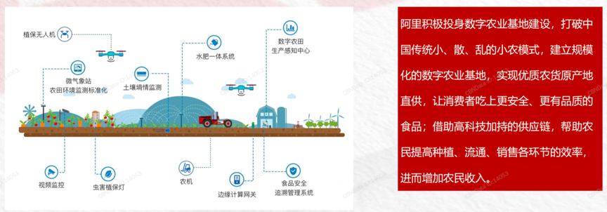 “農(nóng)業(yè)數(shù)字化”驅(qū)動著農(nóng)業(yè)產(chǎn)業(yè)化的步伐,指引著企業(yè)發(fā)展的方向,刷新著農(nóng)業(yè)產(chǎn)業(yè)化的高效產(chǎn)出。根據(jù)中央一號文件指出,要加強(qiáng)現(xiàn)代農(nóng)業(yè)設(shè)施建設(shè),加快物聯(lián)網(wǎng)、大數(shù)據(jù)、區(qū)塊鏈、人工智能、第五代移動通信網(wǎng)絡(luò)、智慧氣象等現(xiàn)代信 息技術(shù)在農(nóng)業(yè)領(lǐng)域的應(yīng)用。同時,根據(jù)阿里研究院《2020阿里農(nóng)產(chǎn)品電商報告》等綜合資訊表明,5G時代來臨、鄉(xiāng)村振興疊加數(shù)字農(nóng)業(yè)相關(guān)政策,將共同助力數(shù)字農(nóng)業(yè)步入快速發(fā)展期,阿里的“數(shù)字農(nóng)業(yè)基地建設(shè)”倍受關(guān)注,農(nóng)產(chǎn)品消費牽引、數(shù)字農(nóng)業(yè)生產(chǎn)加持、農(nóng)業(yè)數(shù)據(jù)大賦能,數(shù)字化農(nóng)業(yè)讓農(nóng)業(yè)產(chǎn)業(yè)化發(fā)展更上一層樓。