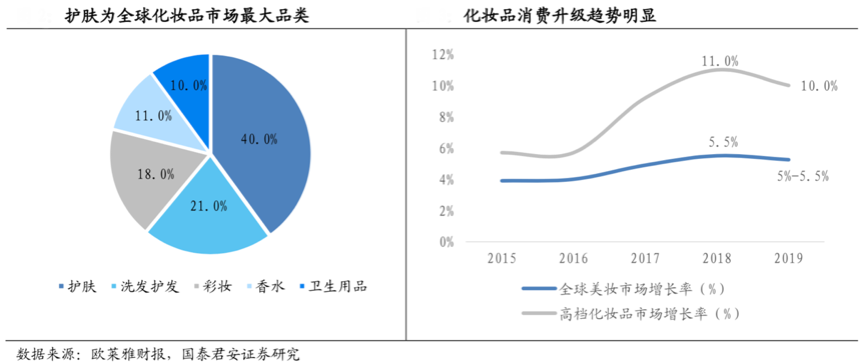 美妝行業(yè),“品類增長”及消費(fèi)升級驅(qū)動行業(yè)大發(fā)展。根據(jù)歐萊雅財報、國泰君安證券研究等綜合資訊表明,2019年全球美妝市場中護(hù)膚、洗護(hù)發(fā)、彩妝為前三大品類,收入占比分別為40%、21%、18%,護(hù)膚品市場2017年以來呈現(xiàn)加速增長趨勢,收入增速從6%提升至8%,同時,近年來高檔化妝品市場增速均為全球市場增速的 2 倍,消費(fèi)升級趨勢明顯。分渠道來看,全球線上渠道增長最為強(qiáng)勁,2018年和2019年全球化妝品線上銷售額增長25%和 27%,但 2019 年線上滲透率僅為 14%,仍有極大提升空間。
