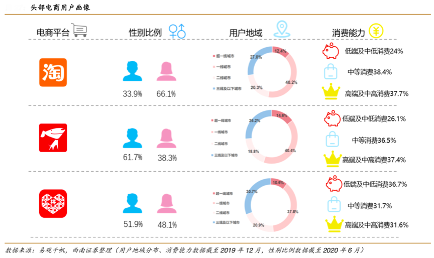 經(jīng)典案例:根據(jù)易觀千帆、西南證券等綜合資訊表明,各頭部電商用戶畫像不同,京東用戶以中高等消費男性為主,淘寶用戶以中高端消費女性為主,而拼多多偏向于中低端下沉市場。對比手機淘寶和拼多多,京東的男性用戶比例高達 61.7%,而手機淘寶、拼多多分別為 33.9%、51.9%。這些正是各科技型互聯(lián)網(wǎng)平臺企業(yè)推進用戶經(jīng)營、推動用戶品牌創(chuàng)新的“堅實人群消費基礎”。