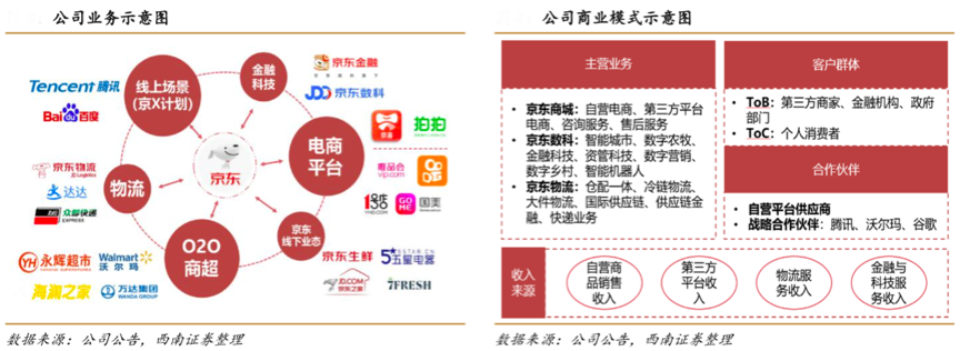 經(jīng)典案例:根據(jù)公司公告、西南證券等綜合資訊表明,經(jīng)過數(shù)十年的發(fā)展,京東商城逐漸發(fā)展成為國內 B2C 市場的頭部綜合型網(wǎng)絡零售商。2013年3月,京東去商城化,全面改名為京東,開始淡化電商色彩,為公司在物流、金融以及互聯(lián)網(wǎng)科技等領域的拓展做鋪墊。