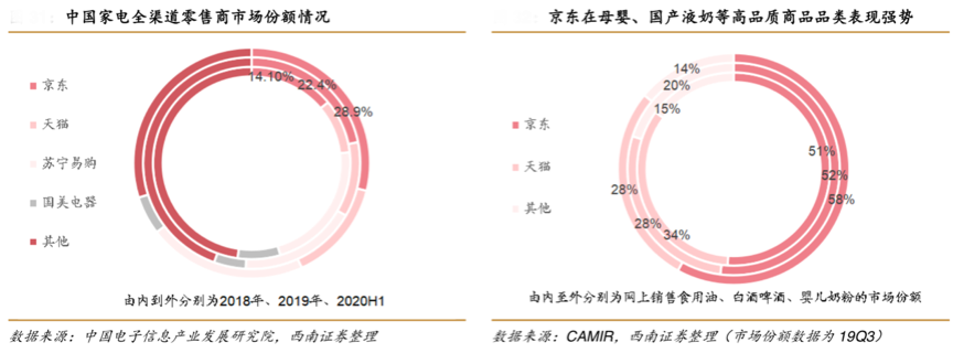 經(jīng)典案例:根據(jù)中國電子信息產(chǎn)業(yè)發(fā)展研究耽、西南證券、CAMIR等綜合資訊表明,京東持續(xù)深耕 3C 數(shù)碼、家用電器市場,市場份額穩(wěn)步提升。根據(jù)中國電子信息產(chǎn)業(yè)發(fā)展研究院相關報告,2018 年、2019 年、2020H1 京東分別占據(jù)中國家電全渠道零售商 14.1%、22.4%、 28.9%的市場份額,線上市場份額均保持在60%以上。這正是其推進科技型產(chǎn)業(yè)品牌建設結出的碩果。