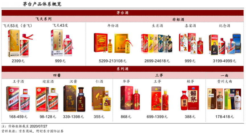 經(jīng)典案例:根據(jù)京東商城、野村東方國際證券等綜合資訊表明,茅臺旗下主要有茅臺酒(53 度普通飛天茅臺、低度茅臺酒,以及附加價(jià)值更 高的非標(biāo)酒包含生肖酒、定制酒、紀(jì)念酒等)與系列酒(一曲三茅四醬,“一曲” 即貴州大曲,“三茅”即賴茅、王茅以及華茅,“四醬”則為茅臺王子酒、茅臺迎賓酒、漢醬酒以及仁酒)。