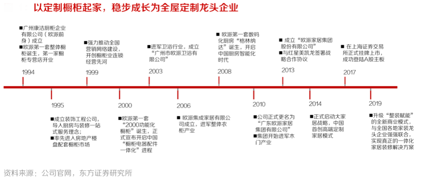 經(jīng)典案例:根據(jù)公司官網(wǎng)、東方證券研究所等綜合資訊表明,歐派家居成立于1994年,由定制櫥柜起步,在之后的 25 年里逐步向全屋產(chǎn)品延伸,分別于2003年、2006年、2010年進(jìn)軍衛(wèi)浴、衣柜及木門產(chǎn)業(yè),并于2014年正式啟動大家居戰(zhàn)略,穩(wěn)步成長為國內(nèi)規(guī)模領(lǐng)先的全屋定制龍頭企業(yè)。