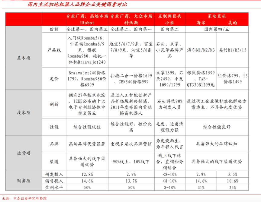 經(jīng)典案例:根據(jù)中泰證券研究所等綜合資訊表明,“掃地機(jī)器人”是強(qiáng)技術(shù)背書行業(yè),產(chǎn)品對技術(shù)的要求比較高,通過國內(nèi)主流掃地機(jī)器人品牌企業(yè)關(guān)鍵因素對比,我們可以發(fā)現(xiàn),升級趨勢下,IRobot、Dyson 國際巨頭紛紛強(qiáng)勢切入高端市場,品牌的情感化體驗(yàn)及價值化要求越來越明確,用戶對產(chǎn)品的要求日益提升。