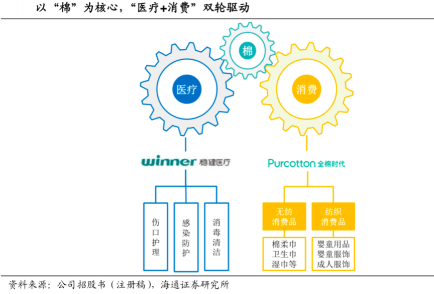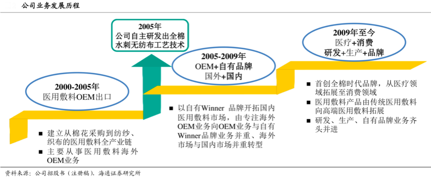 經(jīng)典案例:根據(jù)公司招股說明書、海通證券研究所等綜合資訊表明,穩(wěn)健醫(yī)療以起步于紗布、棉簽等醫(yī)用敷料,2005 年自主研發(fā)出舒適、安全、環(huán)保的全棉水刺無紡布,2009 年成立“Purcotton 全棉時(shí)代”品牌并推出純棉柔巾等代表性產(chǎn)品,成功實(shí)現(xiàn)醫(yī)用產(chǎn)品向家用產(chǎn)品的拓展。其以“品牌全域化發(fā)展”引領(lǐng)著行業(yè)潮流。