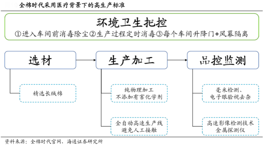 經(jīng)典案例:根據(jù)全棉時(shí)代官網(wǎng)、海通證券研究所等綜合資訊表明,“全棉時(shí)代”的日用品生產(chǎn)線從原材料的采購到生 產(chǎn)過程控制、質(zhì)檢出廠,都沿用了穩(wěn)健醫(yī)療的體系。以環(huán)境衛(wèi)生把控為例,鮮明的踐行了這一高生產(chǎn)標(biāo)準(zhǔn)。