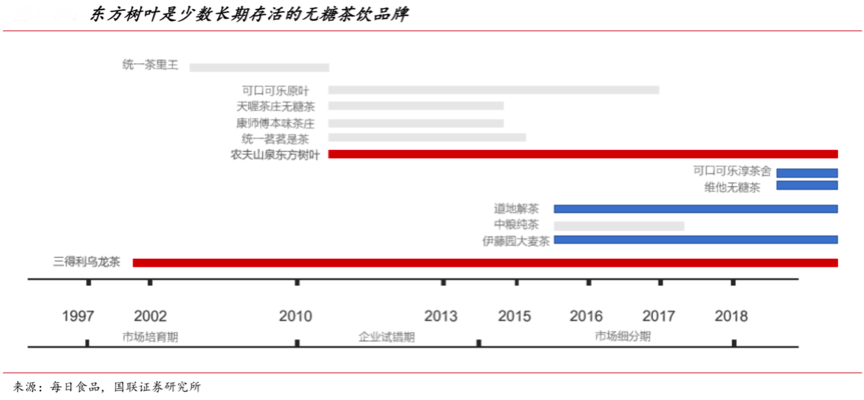 經(jīng)典案例:根據(jù)每日食品、國聯(lián)證券研究所等綜合資訊表明,東方樹葉是少數(shù)長期存活的無糖茶飲品牌,其明確了輕負(fù)擔(dān)概念,通過降糖減肥理念去引導(dǎo)消費(fèi)者,根據(jù)弗若斯特沙利文數(shù)據(jù),東方樹葉在 2019 年成為無糖茶品類市占率第一的品牌。