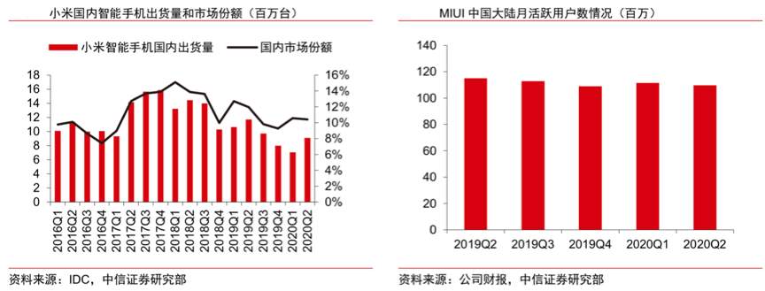 經(jīng)典案例:根據(jù)IDC、中信證券研究部、公司財報等綜合資訊表明,小米MIUI 國內(nèi)用戶是以公司國內(nèi)手機(jī)銷售為基礎(chǔ)的,也是其互聯(lián)網(wǎng)服務(wù)的基本盤,對應(yīng)的主要是國內(nèi)手機(jī)廣告和游戲服務(wù)收入。2018-2019 年,公司在國內(nèi)市場的手機(jī)出貨 量和份額有所下滑,因此國內(nèi) MIUI 用戶在 1.1 億左右徘徊。