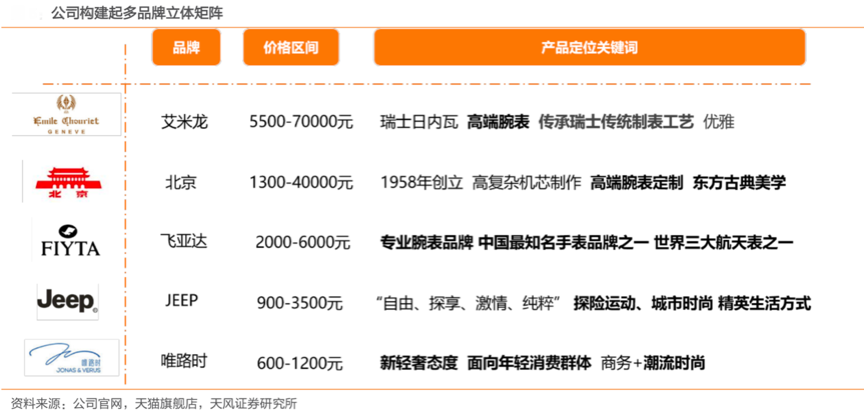 經典案例:根據公司官網、天貓旗艦店、天風證券研究所等綜合資訊表明,飛亞達旗下品牌覆蓋高端、中端及輕奢,傳統美學及城市時尚,國產及海外品牌,面向多元消費群體,“多品牌立體矩陣”日益突出。