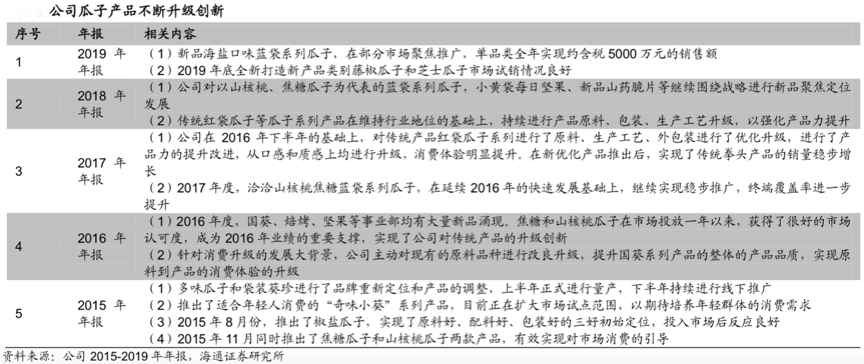 經(jīng)典案例:根據(jù)公司年報、海通證券研究所等綜合資訊表明,2017年,洽洽食品對傳統(tǒng)產(chǎn)品紅袋瓜子系列進(jìn)行了原料、生產(chǎn)工藝、外包裝進(jìn)行了優(yōu)化升級,從口感和質(zhì)感上均進(jìn)行升級,消費體驗明顯提升。同時加大力氣開展賦予藍(lán)袋系列更多的產(chǎn)品內(nèi)涵,提升了品類組合競爭力。