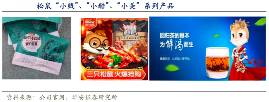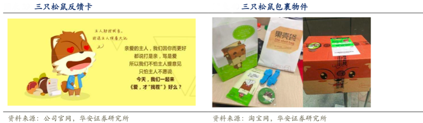 經(jīng)典案例:根據(jù)公司官網(wǎng)、華安證券研究所等綜合資訊表明,“三只松鼠”以堅果起家,松鼠形象和堅 果品類高度契合,代表著不同系列產(chǎn)品,“小酷”——干果類產(chǎn)品,“小賤”——休閑 零食類產(chǎn)品,“小美”——花果類產(chǎn)品。公司更以動畫為建設(shè)支點,持續(xù)性的內(nèi)容輸出幫助建立“縱深產(chǎn)品線”。