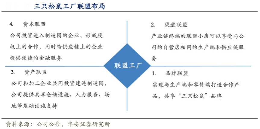 經(jīng)典案例:根據(jù)公司公告、華安證券研究所等綜合資訊表明,2019年末“三只松鼠”宣布與安徽無為市政府以及各大供應(yīng)商達(dá)成合作,將共同斥資 20.6 億元建立聯(lián)盟工廠。聯(lián)盟工廠通過資本、資產(chǎn)、渠道和品牌的四個聯(lián)盟維度,與上游供應(yīng)商、下游零售端實現(xiàn)深度捆綁,從而提高產(chǎn)品供應(yīng)的穩(wěn)定性、品質(zhì)的保障與新品的研發(fā)效率。