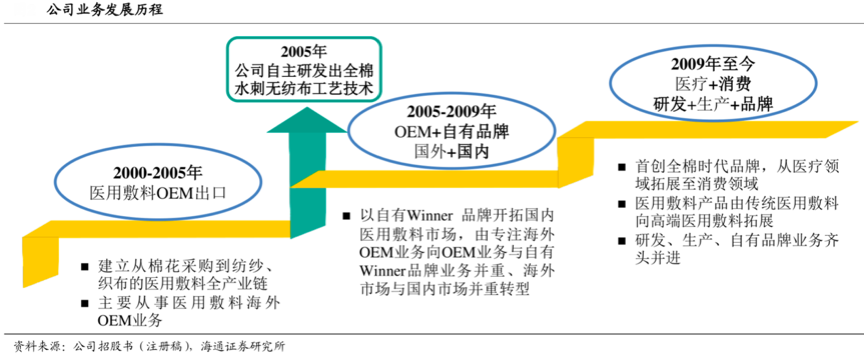 經(jīng)典案例:根據(jù)公司招股說明書、海通證券研究所等綜合資訊表明,穩(wěn)健醫(yī)療起步于紗布、棉簽等醫(yī)用敷料,2005年自主研發(fā)出舒適、安全、環(huán)保的全棉水刺無紡布,2009 年成立“Purcotton 全棉時代”品牌并推出純棉柔巾等代表性產(chǎn)品,成功實現(xiàn)醫(yī)用產(chǎn)品向家用產(chǎn)品的拓展。