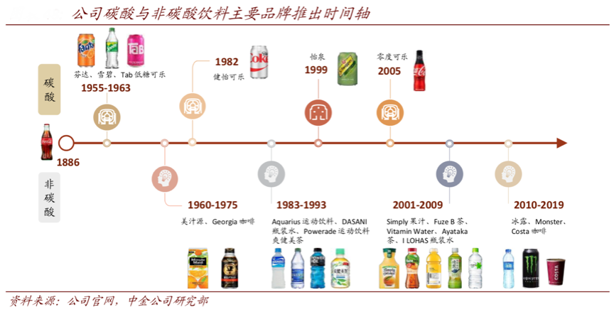 同時(shí),根據(jù)公司官網(wǎng)、中金公司研究部等綜合資訊表明,其于2017年提出要成為“全品類飲料公司”的愿景。2018 年公司共推出約 600 個(gè)新產(chǎn)品,其中超過(guò) 400 個(gè)為非碳酸產(chǎn)品,新品銷量貢獻(xiàn)從 2015 年的 9%升至2018年的17%。