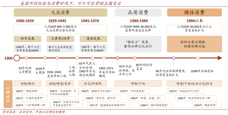 經(jīng)典案例:根據(jù)公司官網(wǎng)、中金公司研究部等綜合資訊表明,可口可樂(lè)的營(yíng)銷主題(即其品牌傳播)多是基于人均GDP現(xiàn)狀,根據(jù)消費(fèi)者飲料消費(fèi)從大眾消費(fèi)向品質(zhì)消費(fèi)、理性消費(fèi)等進(jìn)化的狀況而有效制訂的,前期重點(diǎn)強(qiáng)調(diào)產(chǎn)品口味、正宗產(chǎn)品、可樂(lè)情懷等,中后期向個(gè)性情感、快樂(lè)精神及愉悅生活發(fā)展。