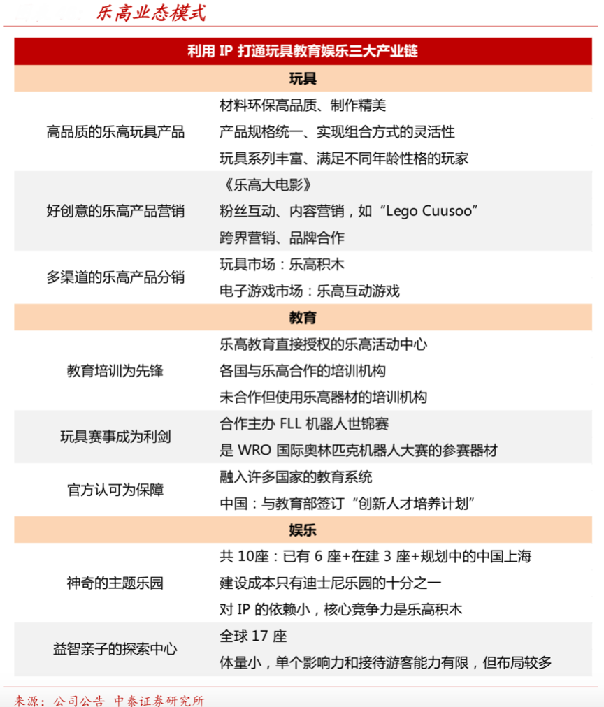 經(jīng)典案例:根據(jù)公司公告、中泰證券研究所等綜合資訊表明,樂高通過“強(qiáng)大品牌IP”打通玩具教育娛樂三大產(chǎn)業(yè)鏈。其既擁有高品質(zhì)的玩具產(chǎn)品和一系列的媒體營銷,又一方面通過活動(dòng)和培訓(xùn)中心來拓展教育業(yè)務(wù),另一方面與官方合作,融入許多國家的教育體系和國際比賽;并以“樂高主題樂園”和“親子探索中心”點(diǎn)亮用戶體驗(yàn)感,“快樂”的品牌形象深入人心。