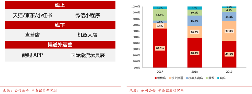 經(jīng)典案例:根據(jù)公司公告、中泰證券研究所等綜合資訊表明,截至到 2019 年末,泡泡瑪特的零售店、線上和機(jī)器人商店的渠道銷售占比分別為 43.9%/32%/14.8%,同比收入增速分別為 198%/424%/188%,均保持了高速增長,其中線上收入的增速最快,其全渠道銷售、全場景互動(dòng)的“消費(fèi)者心智格局”基本形成。