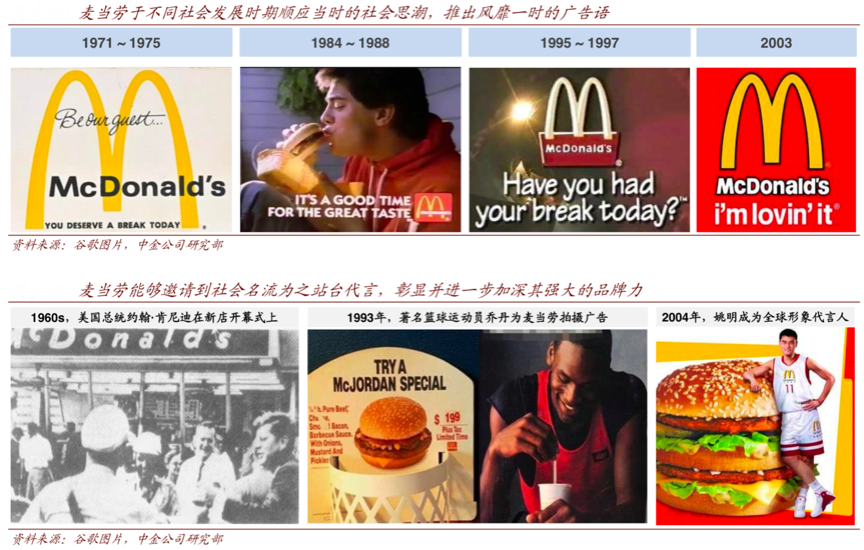 經(jīng)典案例:根據(jù)谷歌圖片、中金公司研究部等綜合資訊表明,麥當勞品牌廣告語從 70 年代“今天你該休息了(You deserve a break today)”順應(yīng)強調(diào)勞動回報的社會思潮,80 年代“麥當勞和你”體現(xiàn)自我導(dǎo)向,再到 2003 年風靡全球的“我就喜歡(i’m lovin’ it)”強調(diào)娛樂價值,塑造“歡樂形象”。其時刻與時俱進,塑造強聯(lián)想力的品牌宣言。