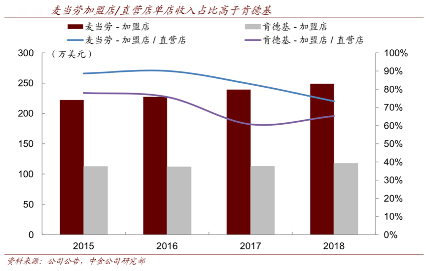 經(jīng)典案例:根據(jù)公司公告、中金公司研究部等綜合資訊表明,麥當勞自1967年開啟全球擴張,先后進入巴西、泰國、中國大陸、印度、越南等地,進入市場和門店擴張的過程也伴隨著當?shù)厣鐣挟a(chǎn) 階級的崛起和居民消費水平的提升,定義了當?shù)鼐用駥τ诿朗娇觳偷恼J知。同時2015-2018 年麥當勞加盟店單店收入占直營店單店收入比例的均值達 84%,而同時期肯德基的比例均值為 70%。