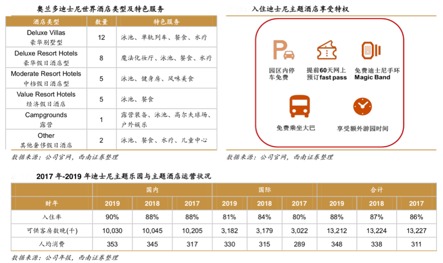 經(jīng)典案例:根據(jù)公司官網(wǎng)、西南證券等綜合資訊表明,在主題酒店方面,奧蘭多迪士尼世界提供 4 種迪士尼主題酒店、1 種露營(yíng)地和 1 種非迪 士尼酒店,共用 6 種酒店類型,33 家酒店可供選擇,每晚住宿價(jià)格從 55 到 350 不等。根據(jù) 2017 年財(cái)報(bào)顯示,迪士尼在美國(guó)國(guó)內(nèi)主題樂(lè)園的酒店每間客房消費(fèi)增長(zhǎng) 6%,入住率穩(wěn)定在 90%左右。