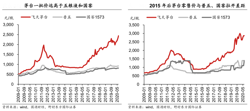 經(jīng)典案例:根據(jù)wind、國(guó)酒財(cái)經(jīng)、野村東方國(guó)際證券等綜合資訊表明,公司 1958 年推出核心大單品飛天茅臺(tái),目前飛天茅臺(tái)約占公司酒類(lèi)收入的 70%-80%,目前飛天茅臺(tái)的出廠價(jià)、一批價(jià)和終端價(jià)分別為 969 元、2440 元和 2868 元左右,和五糧 液出廠價(jià)、一批價(jià)和終端價(jià)價(jià)差分別為 80 元、1770 元和 1469 元左右,和國(guó)窖價(jià)差為159 元、1890 元和 1469 元左右,差距拉開(kāi)顯著。