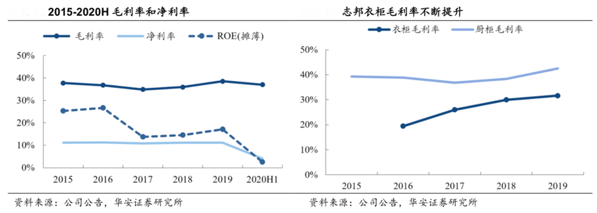 經(jīng)典案例:根據(jù)公司公告、華安證券研究所等綜合資訊表明,受益于大宗客戶結(jié)構(gòu)調(diào)整、衣柜業(yè)務(wù)毛利率的提升以及志邦家居公司對(duì)供應(yīng)鏈的科學(xué)管理和精細(xì)化生產(chǎn)管理,2019 年志邦的銷售毛利率同比增加了 2.58 個(gè) pct 至38.5%。2015-2019 年公司的凈利率一直保持在 11%左右,而上市后 ROE(攤薄)連續(xù)兩年呈上升趨勢(shì)。