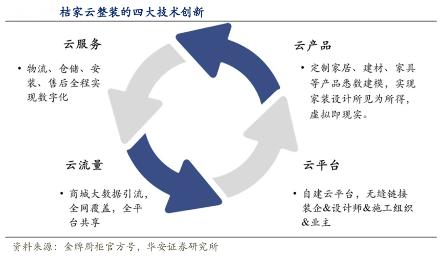 經(jīng)典案例:根據(jù)金牌櫥柜官方號(hào)、華安證券研究所等綜合資訊表明,金牌櫥柜于2019 年開設(shè)了兩家桔家云整裝的直營(yíng)門店。其將以公司櫥、衣、木產(chǎn)品作為核心,整合其他家居品類,為中小家裝公司及設(shè)計(jì)工作室提供供應(yīng)鏈支撐。金牌桔家云整裝的六大核心優(yōu)勢(shì)體現(xiàn)在精耕整裝的專業(yè)優(yōu)勢(shì)、全屋定制的產(chǎn)研優(yōu)勢(shì)、建材家具的精選優(yōu)勢(shì)、一鍵打通的效率優(yōu)勢(shì)、平臺(tái)模式的發(fā)展優(yōu)勢(shì)以及上市公司的資金優(yōu)勢(shì)。桔家云整裝的四大技術(shù)創(chuàng)新包括云產(chǎn)品、云 平臺(tái)、云流量和云服務(wù)。