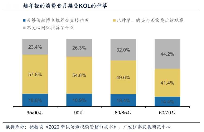 經(jīng)典案例:根據(jù)微播易、廣發(fā)證券發(fā)展研究中心等綜合資訊表明,結(jié)合Questmobile的數(shù)據(jù)統(tǒng)計(jì),90后和00后對互聯(lián)網(wǎng)粘性更強(qiáng),互聯(lián)網(wǎng)用戶規(guī)模的增 長速度以及互聯(lián)網(wǎng)使用時長的強(qiáng)度相比其他代際都有明顯優(yōu)勢,是新消費(fèi)品品牌在新渠道之中最容易調(diào)動的潛在消費(fèi)群體。微播易用戶對網(wǎng)紅博主推薦產(chǎn)品接受度調(diào)研也顯示18.8%的95/90后會直接購買足夠信賴的博主推薦的商品。