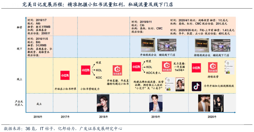 經(jīng)典案例:根據(jù)36氪、IT桔子、億邦動力和廣發(fā)證券發(fā)展研究中心等綜合資訊表明,完美日記的營銷路徑為:(1)前期小紅書密集種草,借助時尚圈以及粉圈 積累粉絲,通過明星為品牌帶流量;(2)中期小紅書持續(xù)種草,開始發(fā)力直播,同 時建立私域流量,著重私域流量運(yùn)營;(3)后期持續(xù)運(yùn)營小紅書、直播以及社群, 開始加快線下門店鋪設(shè),同時投放分眾樓宇廣告以擴(kuò)大品牌知名度。