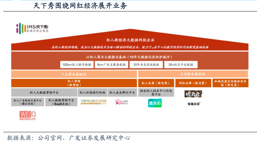 經(jīng)典案例:根據(jù)公司官網(wǎng)、廣發(fā)證券發(fā)展研究中心等綜合資訊表明,“天下秀”手握KOL資源以及歷史投放大數(shù)據(jù),目前通過WEIQ進(jìn)行的紅人推廣訂單互動數(shù)已經(jīng)超過5000萬次,為品牌主帶來約百億次的總曝光。公司的技術(shù)能力,以及海量KOL賬號資源和以往的訂單數(shù)據(jù)支撐公司銷售團(tuán)隊(duì)對于KOL賬號和廣告主網(wǎng)紅營銷需求的理解力能夠勝于同行。