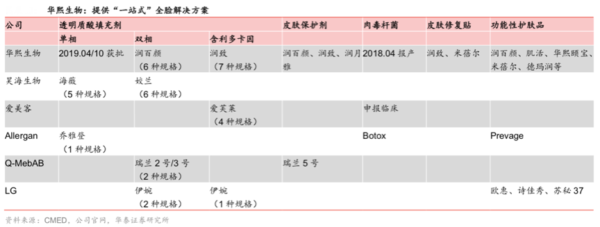經(jīng)典案例:根據(jù)CMED、公司官網(wǎng)、華泰證券研究所等綜合資訊表明,華熙新品頻出,其開發(fā)了不同層次和注射部位 的透明質(zhì)酸填充產(chǎn)品,全面覆蓋低頻(填充劑:6-12 個月/次,肉毒:4-6 個月/次)、中頻 (醫(yī)用皮膚保護劑、皮膚修護貼,1-2 個月/次)、高頻(系列護膚品,1-2 次/天),針對醫(yī)美產(chǎn)品進行全方位覆蓋提升。