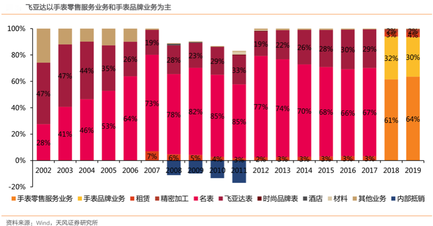 經(jīng)典案例:根據(jù)wind、天風證券研究所等綜合資訊表明,飛亞達2019年公司手表零售業(yè)務實現(xiàn)營收 23.53 億元,占比63.52%;手表品牌業(yè)務實現(xiàn)營收11.11億 元,占比29.98%。隨著公司品牌矩陣進一步完善、品牌運營能力加強,公司手表品牌業(yè)務所占比重呈上升趨勢。2018年起公司開拓精密加工業(yè)務,2019年收入為 0.91 億元,占比約 2%。此外,2019 年公司租賃業(yè)務收入 1.32 億元,占比約為 4%。
