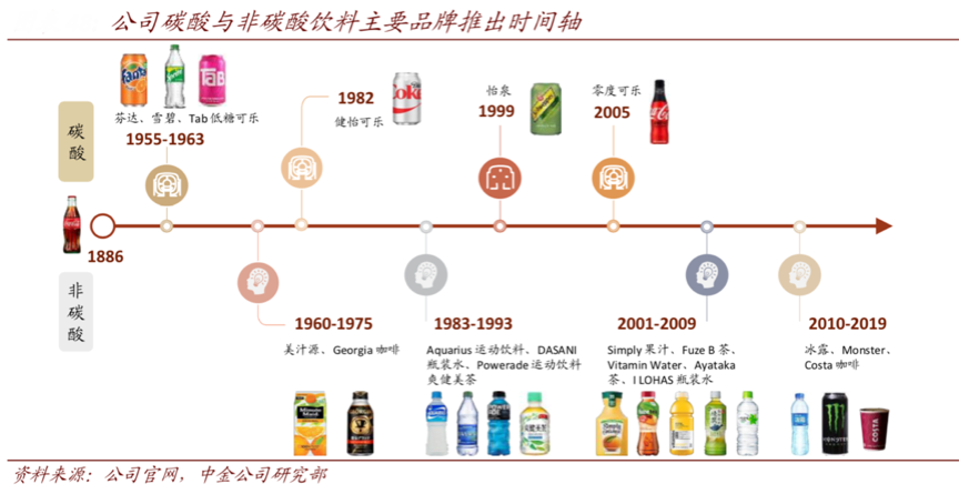 經(jīng)典案例:根據(jù)公司官網(wǎng)、中金公司研究部等綜合資訊表明,可口可樂公司從碳酸飲料品類擴充到“飲料關聯(lián)品類”快速拓展,其于2017年更是提出了要成為“全品類飲料公司”的愿景;2018年其共推出約 600 個新產(chǎn)品,其中超過 400個為非碳酸產(chǎn)品,新品銷量貢獻從 2015 年的 9%升至 2018 年的 17%。