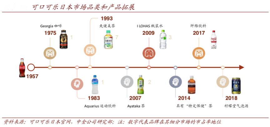 經(jīng)典案例:根據(jù)可口可樂日本官網(wǎng)和中金公司研究部等綜合資訊表明,隨著年輕人對咖啡消費需求增加,可口可樂于 1975 年率先推出罐裝即飲咖啡“Georgia”,其已經(jīng)成為日本即飲咖啡最暢銷品牌。在競爭激烈的茶飲和瓶裝水領域,可口可樂則主打差異化,推出區(qū)別于市場主流的混合茶“爽健美茶”及綠茶“Ayataka”,及礦物質水“I LOHAS”,切入空白市場,搶占行業(yè)先機。