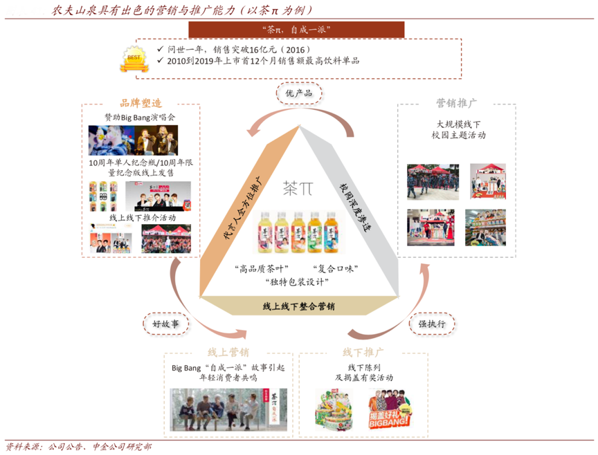 經(jīng)典案例:根據(jù)公司公告、中金公司研究部等綜合資訊表明,自 1996 年以來,農(nóng)夫山泉在產(chǎn)品推廣方面極具競爭力,針對消費者心智洞察到位,例如在 2011 年無糖茶市場蓬勃發(fā)展之前即完成無糖茶東方樹葉的布局,該產(chǎn)品在 2017 年無糖茶市場高速發(fā)展期充分享受到了行業(yè)爆發(fā)紅利,同時成為行業(yè)第一品牌。“天然與健康產(chǎn)品”的經(jīng)營理念,形成對消費者心智的有力搶占。