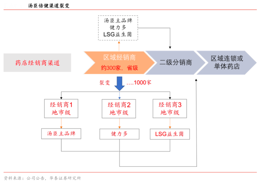 經(jīng)典案例:根據(jù)公司公告、華泰證券研究所等綜合資訊表明,2020年湯臣倍健啟動“經(jīng)銷商裂變計劃”,在 VDS 業(yè)務中建立主業(yè)、“健力多”、“Life-space”三個完全獨立的經(jīng)銷商體系。同時其經(jīng)銷商新增以原有經(jīng)銷商裂變?yōu)橹鳎?nbsp;以地級市為單位搭建經(jīng)銷商體系,未達到裂變標準的區(qū)域?qū)⒄心夹陆?jīng)銷商,預計經(jīng)銷商數(shù)量將有大幅增加。