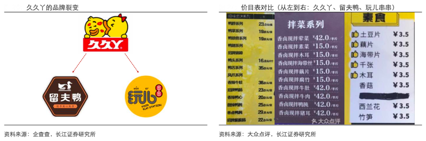 經(jīng)典案例:根據(jù)企查查、大眾點(diǎn)評(píng)、長(zhǎng)江證券研究所等綜合資訊表明,久久丫創(chuàng)立于 2002 年,產(chǎn)品以鮮貨的鴨副鹵味為主,偏重居家、休閑場(chǎng)景,截止 2018 年 8 月全國(guó)開(kāi)店超 1300 家;2008 年久久丫再次創(chuàng)業(yè),創(chuàng)辦“留夫鴨”品牌,產(chǎn)品除了各類鴨副鹵味,還增加了一些經(jīng)典的餐桌菜肴(雞鴨肉、豬蹄、煎帶魚(yú)、排條、武昌魚(yú)等);2011 年,久久丫又創(chuàng)辦了冷鍋串串品牌“玩兒串串”,冷鍋串串產(chǎn)品具有極強(qiáng)的休閑屬性,且單價(jià)更低、食用更方便,消費(fèi)門檻低,更容易勾起消費(fèi)沖動(dòng)。