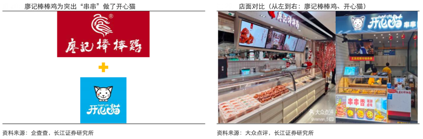 經(jīng)典案例:根據(jù)企查查、大眾點(diǎn)評(píng)、長(zhǎng)江證券研究所等綜合資訊表明,廖記棒棒雞創(chuàng)立于 1993 年,崛起于西南,全國(guó)開(kāi)店超 600 家,經(jīng)營(yíng)鹵菜、拌菜、串串等。同時(shí)其于2018年又創(chuàng)辦新品牌“開(kāi)心貓”串串香,縮減廖記本店的柜面,將原有的“三個(gè)區(qū)域”包裝食品、菜肴熟食、冷鍋串串縮減為以“冷鍋串串”為主,店鋪更小,精準(zhǔn)聚焦商場(chǎng)中“逛吃”的休閑需求。