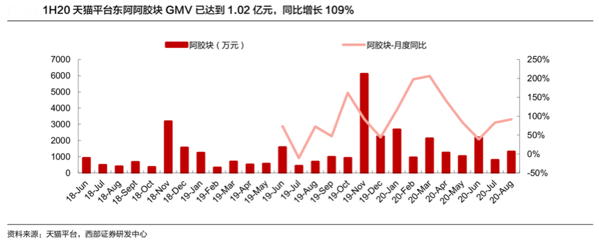 經(jīng)典案例:根據(jù)天貓平臺、西部證券研發(fā)中心等綜合資訊表明,2020年為東阿阿膠數(shù)字化轉(zhuǎn)型、戰(zhàn)略進(jìn)軍線上市場元年,根據(jù)爬蟲數(shù)據(jù)顯示,1H20 天貓平臺阿膠塊 GMV 已達(dá)到 1.02 億元,同比增長109%。