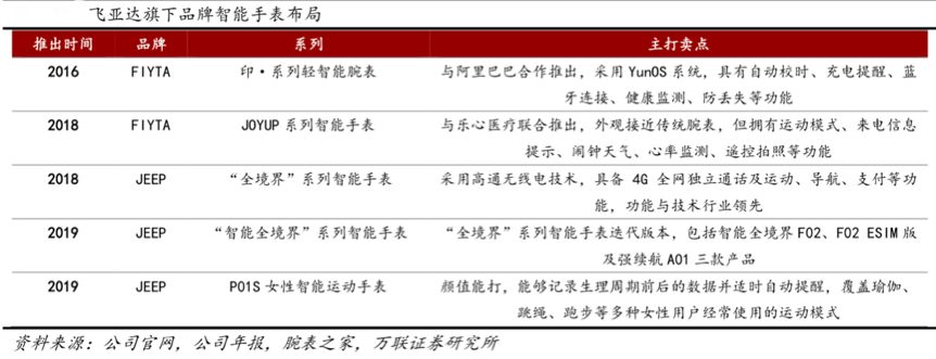 經(jīng)典案例:根據(jù)公司官網(wǎng)、公司年報、腕表之家、萬聯(lián)證券研究所等綜合資訊表明,2016年起其通過“FIYTA”與“JEEP”品牌布局智能手表領(lǐng)域,其先后聯(lián)合阿里巴巴與樂心醫(yī)療推出印·系列輕智能腕表、有氧能力“JOYUP”系列、主打獨 立通話、智能互聯(lián)功能“全境界”系列以及女性健康管理“P01S”智能手表,2019年 ESIM版“智能全境界”智能手表新品為中國聯(lián)通官方首批認證的智能手表,在智能手表通訊領(lǐng)域技術(shù)領(lǐng)先。