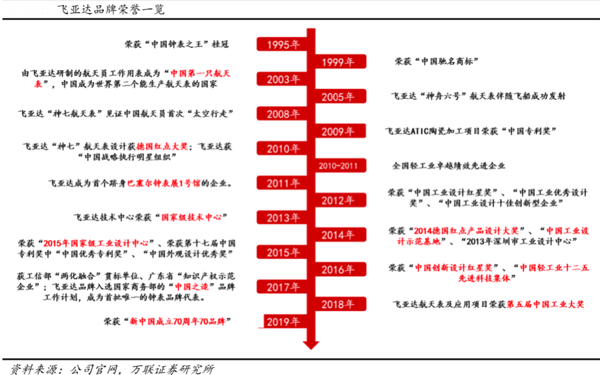 經(jīng)典案例:根據(jù)公司官網(wǎng)、萬聯(lián)證券研究所等綜合資訊表明,“飛亞達”是國內(nèi)手表領(lǐng)軍品牌、世界三大航天表品牌之一,2011年作為首個源于中國的國際腕表品牌進駐瑞士巴塞爾鐘表展1號館,并連續(xù)9年參展;2019年,作為腕表行業(yè)唯一一家代表品牌,飛亞達榮登“新中國成立70周年70品牌”榜單。
