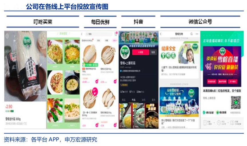 經(jīng)典案例:根據(jù)各平臺(tái)APP、申萬(wàn)宏源研究等綜合資訊表明,雪榕生物將2020年定位為雪榕消費(fèi)品牌戰(zhàn)略元年,其與永輝超市、家家樂(lè)、華潤(rùn)萬(wàn)家、家樂(lè)福、沃爾瑪?shù)榷嗉掖笮蜕坛约昂旭R、叮咚等新零售平臺(tái)合作,每月打造“雪榕主題活動(dòng)月”,同時(shí)通過(guò)多種主流線上自媒體平臺(tái),如微信公眾號(hào)、微博、抖音等平臺(tái)進(jìn)行品牌宣傳。