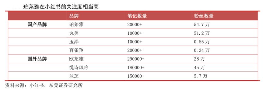 經(jīng)典案例:根據(jù)公司官網(wǎng)、東莞證券研究所等綜合資訊表明,珀萊雅在小紅書平臺的相關筆記數(shù)量達到 2 萬多條,且珀萊雅自身的小紅書賬號的粉絲數(shù)量達到 54.7 萬,在國產(chǎn)品牌內(nèi)排名前列。