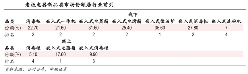 經(jīng)典案例:根據(jù)公司公告、中銀證券等綜合資訊表明,2015年老板電器推出下翻嵌入式洗碗機,定義廚房高端生活美學; 2019 年推出臺嵌兩用洗碗機,解決安裝改造問題,持續(xù)引領行業(yè)發(fā)展。據(jù)老板電器2019年年報披露,老板嵌入式一體機、嵌入式電蒸箱、嵌入式電烤箱、嵌入式洗碗機市場份額分別為 21.6%(市場第 2)、31.6%(市場第 2)、25.4%(市場第 2)、7.0%(市場第 4)。
