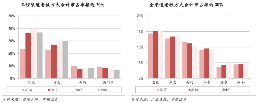 經(jīng)典案例:根據(jù)奧維云網(wǎng)、中銀證券、產(chǎn)業(yè)在線等綜合資訊表明,家電渠道由 C 端主導正向“B端化”推進,以工程渠道為例,精裝修市場中品牌集中度相對較高,老板、方太市占率合計約70%,高于兩者全渠道合計市占率30%,全渠道及工程渠道的客戶價值日益明顯。