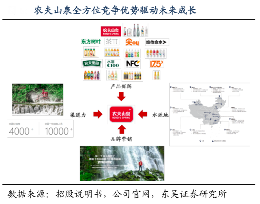 經(jīng)典案例:根據(jù)招股說明書、公司官網(wǎng)、東吳證券研究所等綜合資訊表明,農(nóng)夫山泉二十余年專注深耕,首先在飲用水、功能飲料、茶飲料和果汁飲料上均有全面的布局,在飲用水方面推廣中大規(guī)格提高家庭消費場景的滲透,并通過無糖茶飲料、純果汁等產(chǎn)品卡位健康化的需求趨勢;并有咖啡、氣泡水等潛力產(chǎn)品儲備。在全面產(chǎn)品布局基礎上,農(nóng)夫山泉通過 4,454 名經(jīng)銷商覆蓋全國 超過 243 萬個終端的渠道力、多樣營銷方式打造的強大品牌力和十大優(yōu)質(zhì)水源地保障的高品質(zhì)低成本生產(chǎn)能力,構建起了農(nóng)夫山泉的競爭優(yōu)勢。