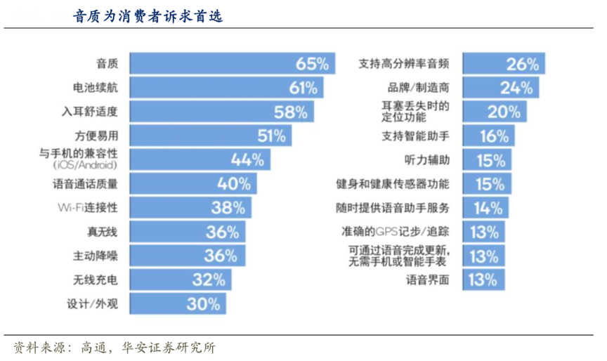 經(jīng)典案例:根據(jù)高通、華字證券研究所等綜合資訊表明,結(jié)合高通發(fā)布的調(diào)研報(bào)告《2019 全球消費(fèi)者音頻產(chǎn)品使用現(xiàn)狀調(diào)研報(bào)告-真無(wú)線耳機(jī)篇》顯示,消費(fèi)者對(duì)耳機(jī)音質(zhì)的重視程度高達(dá) 65%。另外,由于 TWS 耳機(jī)使用期間無(wú)法連接充電,同時(shí),與耳機(jī)搭配使用的手機(jī)在續(xù)航能力上的逐漸提高,延長(zhǎng)耳機(jī)電池的續(xù)航時(shí)間也成為消費(fèi)者的重要訴求,其占比僅次于音質(zhì)需求,達(dá)到 61%。