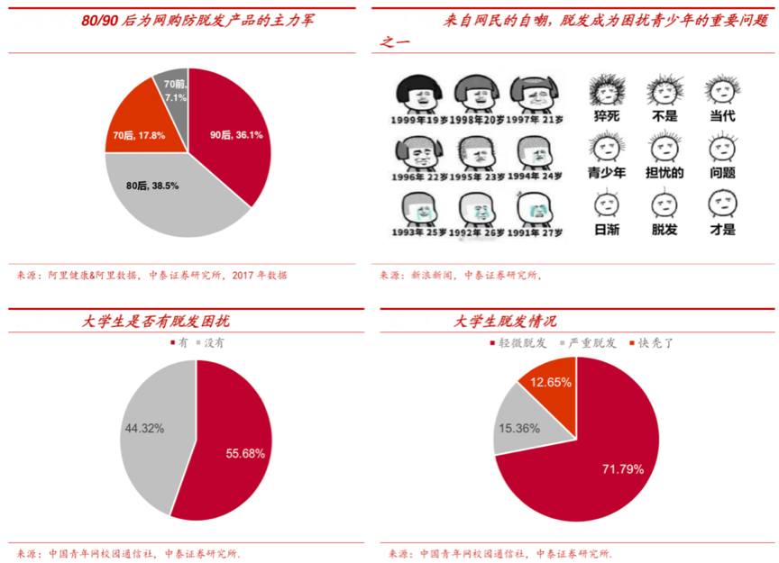 “假發(fā)消費(fèi)”因人而異,大眾對(duì)消費(fèi)者的認(rèn)知度更高,消費(fèi)場(chǎng)景需要極大化點(diǎn)亮。根據(jù)阿里健康&阿里數(shù)據(jù)、中泰證券研究所、新浪新聞、中國(guó)青年網(wǎng)校校園通信社等綜合資訊表明,超 5 成大學(xué)有脫發(fā)困擾,該人群中超 7 成處于輕微脫發(fā)狀態(tài)。阿里健康、阿里數(shù)據(jù)的網(wǎng)購(gòu)調(diào)查顯示,購(gòu)買防脫產(chǎn)品的 90 后占比(36.1%) 基本與 80 后(38.5%)持平,可見(jiàn)脫發(fā)現(xiàn)象一代比一代早。