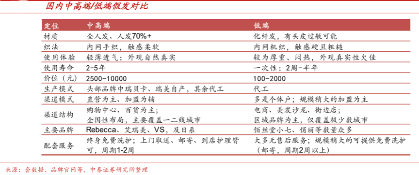 “品牌化假發(fā)消費(fèi)”成風(fēng),中高端假發(fā)消費(fèi)風(fēng)起。根據(jù)套數(shù)據(jù)、品牌官網(wǎng)、中泰證券研究所等綜合資訊表明,目前國(guó)內(nèi)中高端假發(fā)以人發(fā)為主(占比在 70%及以上),產(chǎn)品輕薄透氣且逼真度高,具有完善的售后服務(wù)。并且行業(yè)參與者較少(主 要以 Rebecca、Iremy、VS 三個(gè)國(guó)牌為主,此外還有日系品牌 Aderans), 且多形成全國(guó)性布局,并以直營(yíng)為主的方式覆蓋一二線城市的百貨/購(gòu)物中心;該市場(chǎng)主要比拼產(chǎn)品、品牌及渠道布局,參與者少且競(jìng)爭(zhēng)溫和。