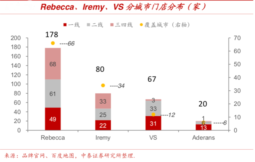 “高檔假發(fā)消費(fèi)體驗(yàn)”引領(lǐng)著假發(fā)消費(fèi)變革,百貨及購(gòu)物中心等“品質(zhì)性終端”提供著優(yōu)質(zhì)的品牌體驗(yàn)。根據(jù)品牌官網(wǎng)、百度地圖、中泰證券研究所等綜合資訊表明,現(xiàn)階段中國(guó)仍處于假發(fā)需求興起階段,百貨及購(gòu)物中心是主要布局的渠道,同時(shí)中高端品牌以覆蓋一 二線城市為主,如 Rebecca、Iremy一線5城渠道數(shù)量占比均達(dá)28%,VS 近 50%。